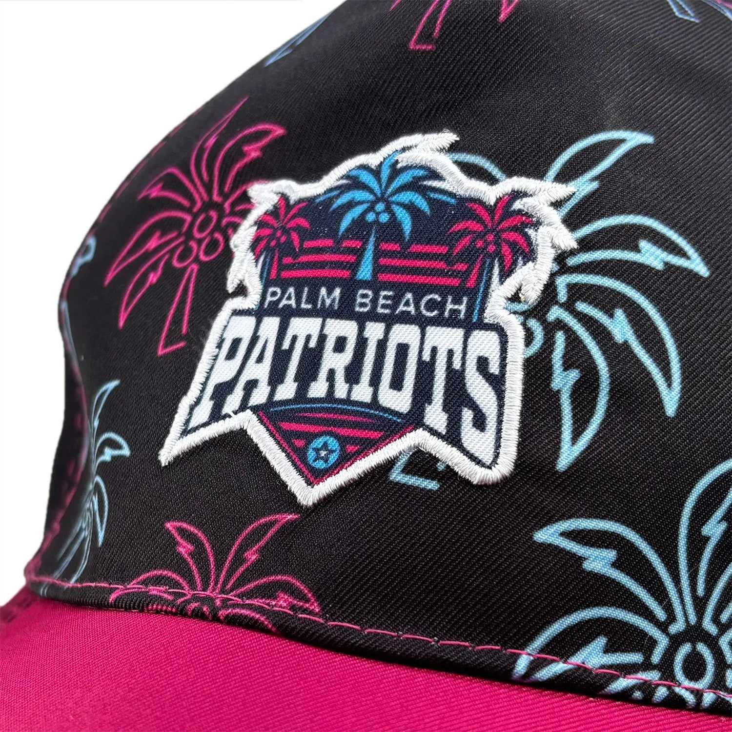 Show your tropical spirit with the Palm Beach Patriots baseball cap. This cap features a black base with vibrant pink and blue palm tree patterns and a magenta brim. The adjustable snapback ensures a perfect fit for all-day wear.