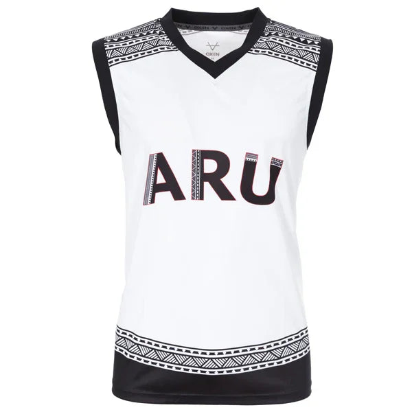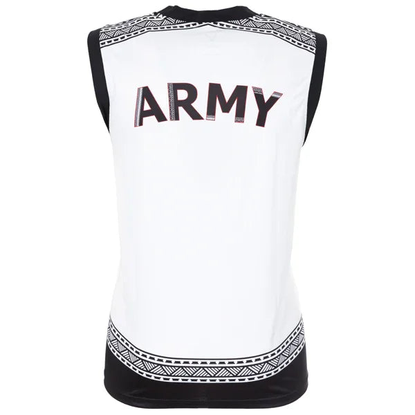 Make a statement on and off the court with the Oxen Army ARU Fiji 2023 Mens Basketball Vest, featuring a clean white design accented with striking Fijian-inspired tribal patterns along the shoulders and hem in bold black detailing. This premium basketball vest showcases the "ARU" lettering front and "ARMY" on the back, complemented by the distinctive tribal pattern borders that celebrate the connection between Army Rugby and Pacific island heritage. Engineered with performance fabric technology, this vest delivers superior comfort and unrestricted movement while maintaining a sharp, professional appearance.