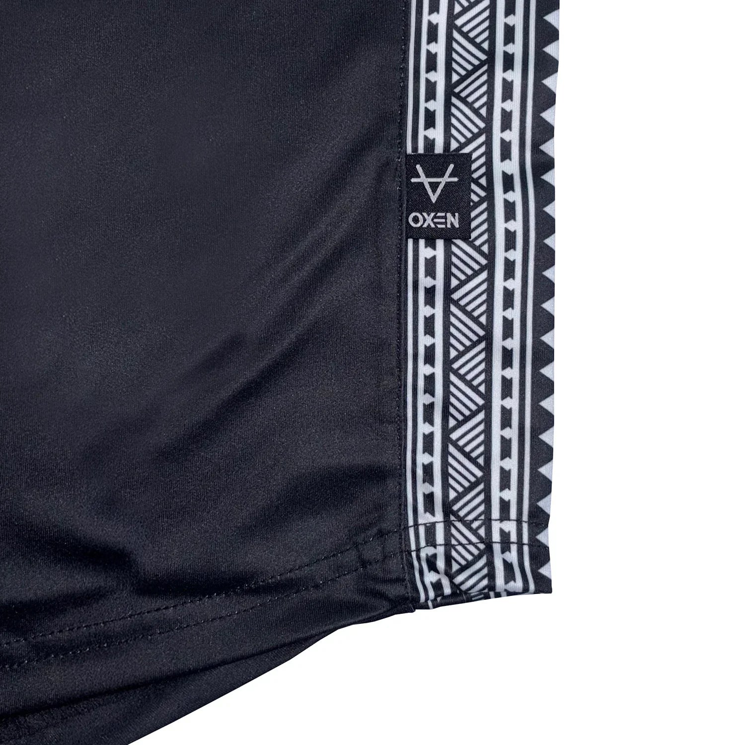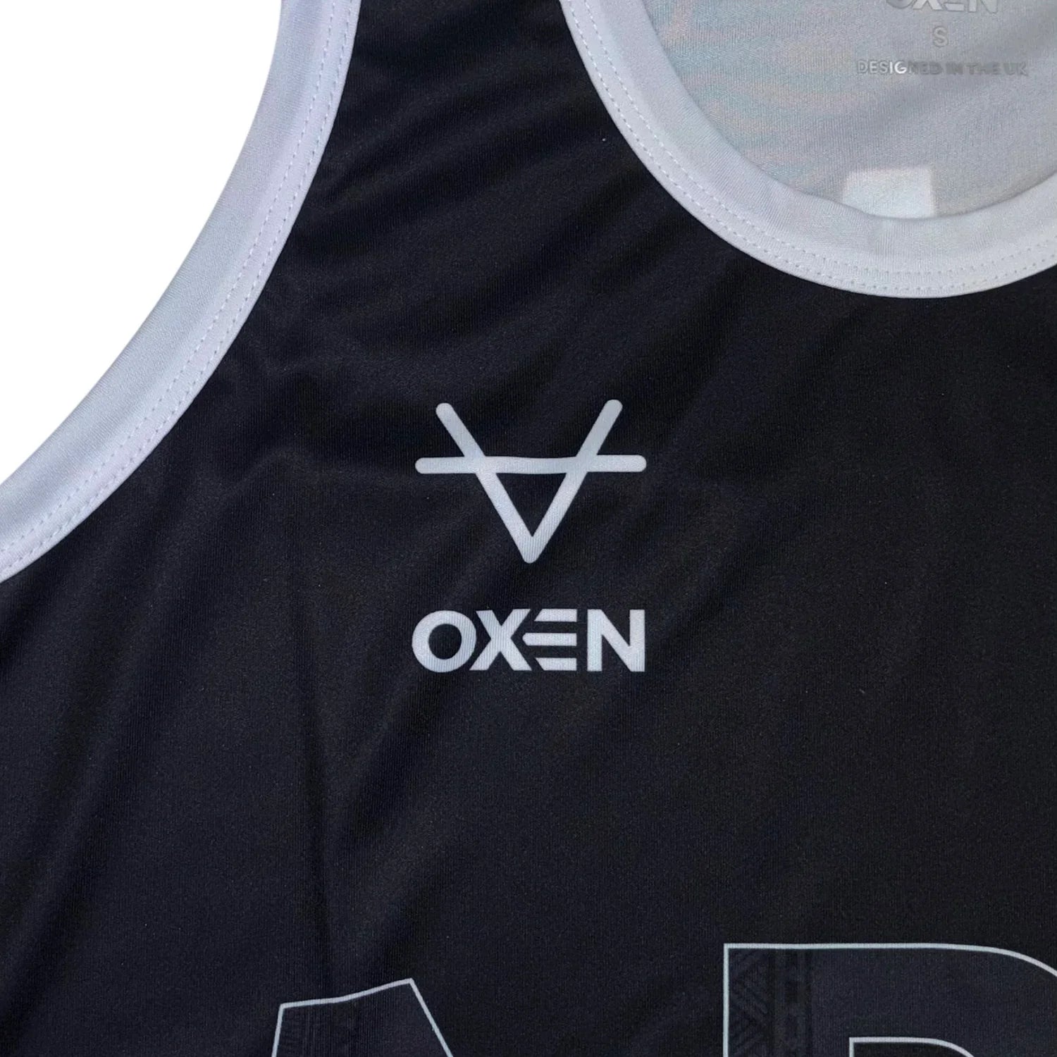 Dominate your training sessions in the Oxen Army ARU Fiji 2024 Mens Training Vest Black, featuring a sleek black design accented with striking Fijian-inspired tribal patterns along the sides in crisp white detail. The professional-grade vest combines "ARU" branding on the front and "ARMY" lettering on the back, while the contrast white trim and official ARU crest create a powerful statement of military precision and Pacific rugby heritage. Engineered with advanced moisture-wicking technology, this training vest delivers superior ventilation and unrestricted movement for peak performance.