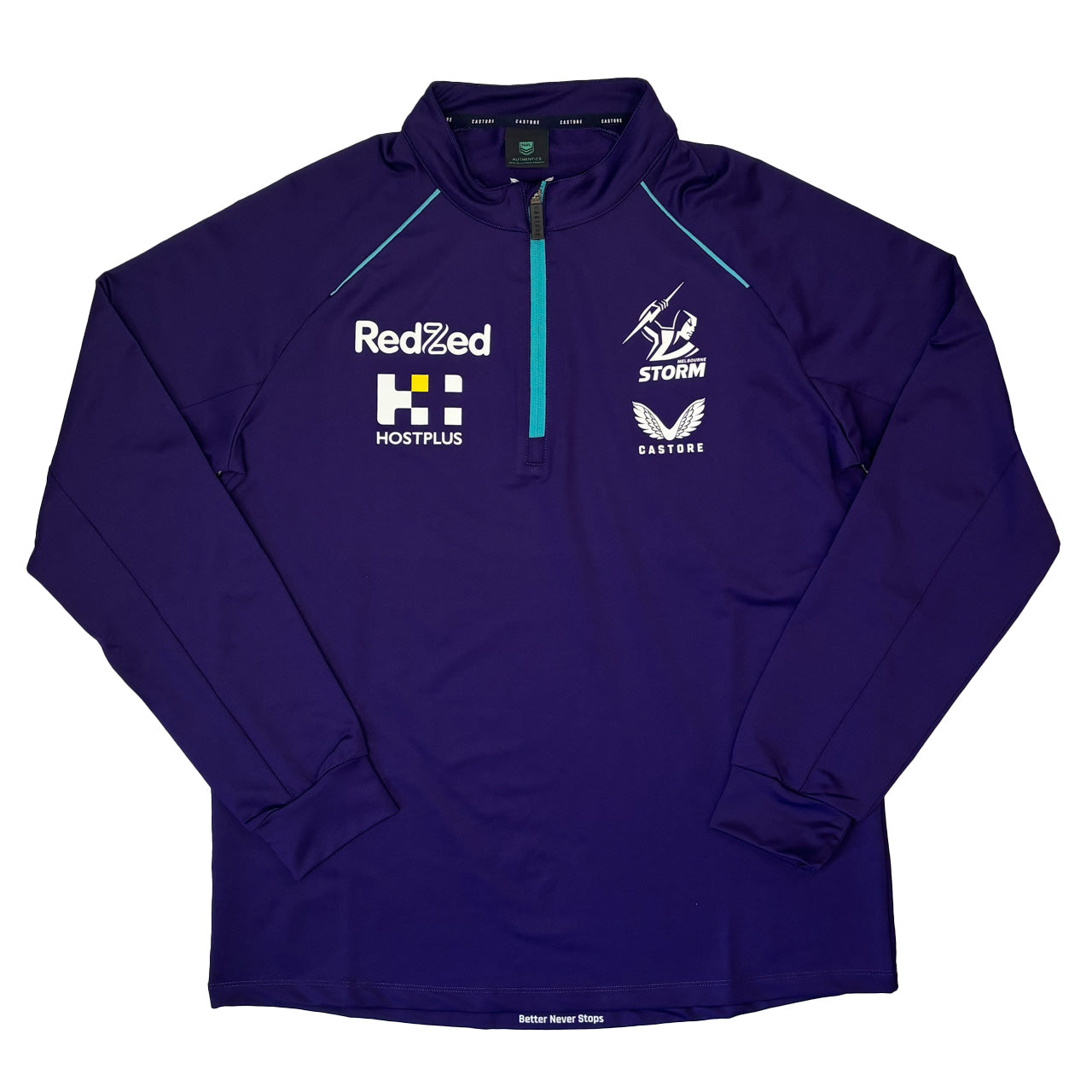 Castore Melbourne Storm 2022 Mens Training 1/4 Zip Top Purple is built for comfort and performance during training or casual wear. Made with lightweight, breathable fabric, it helps regulate body temperature while keeping you comfortable on the move. Featuring the Melbourne Storm crest, sponsor logos, and a stylish quarter-zip design, it’s perfect for showing your support on and off the field.