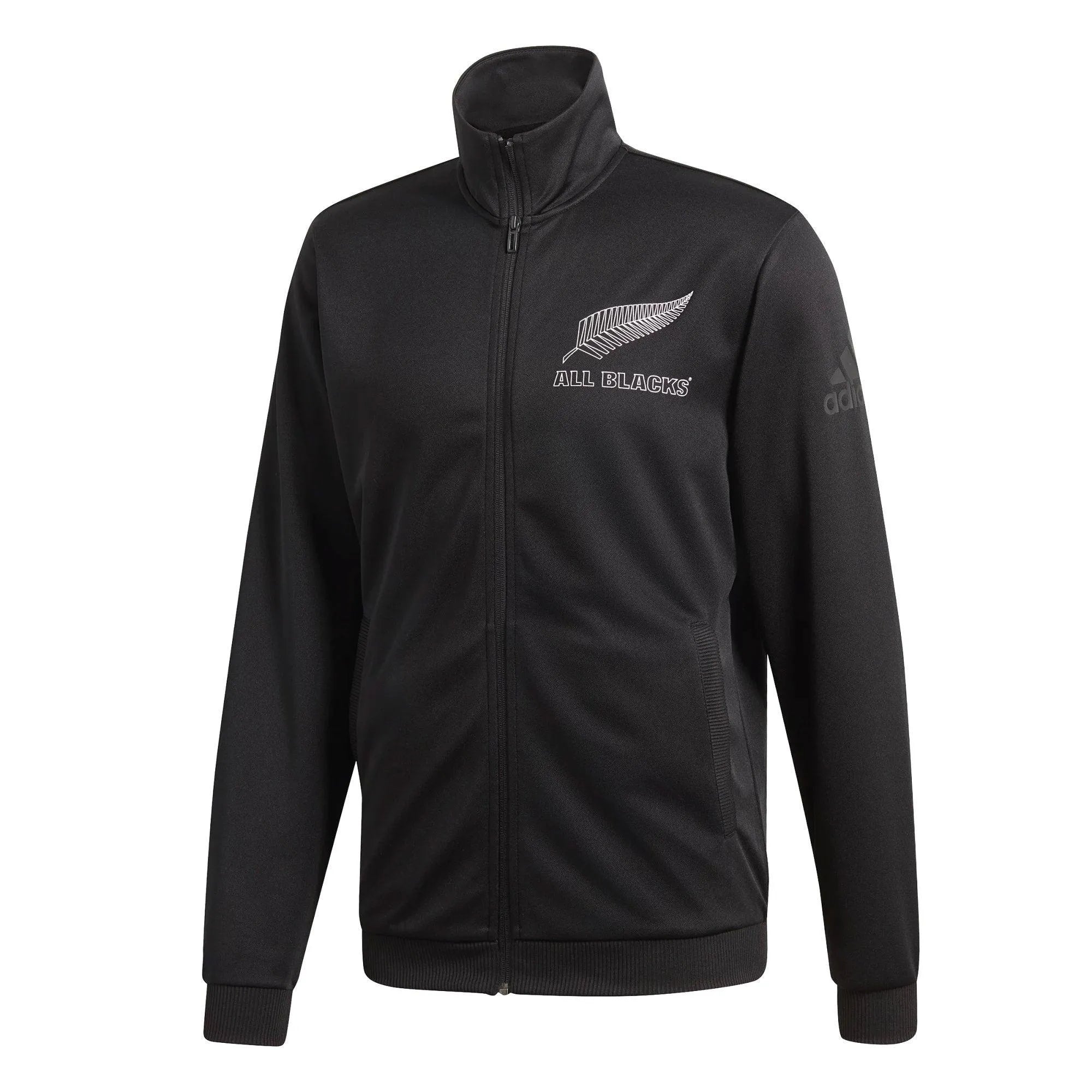 Dressed in the All Blacks' imposing colours, this track jacket pays tribute to the team's dominating rugby. It's built in thick doubleknit fabric and has a stand-up collar for extra coverage. The team's famous silver fern sits on the chest.