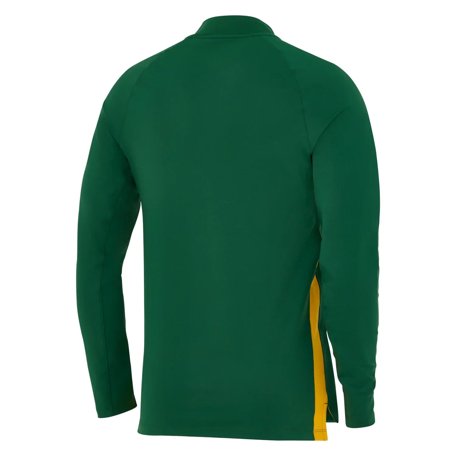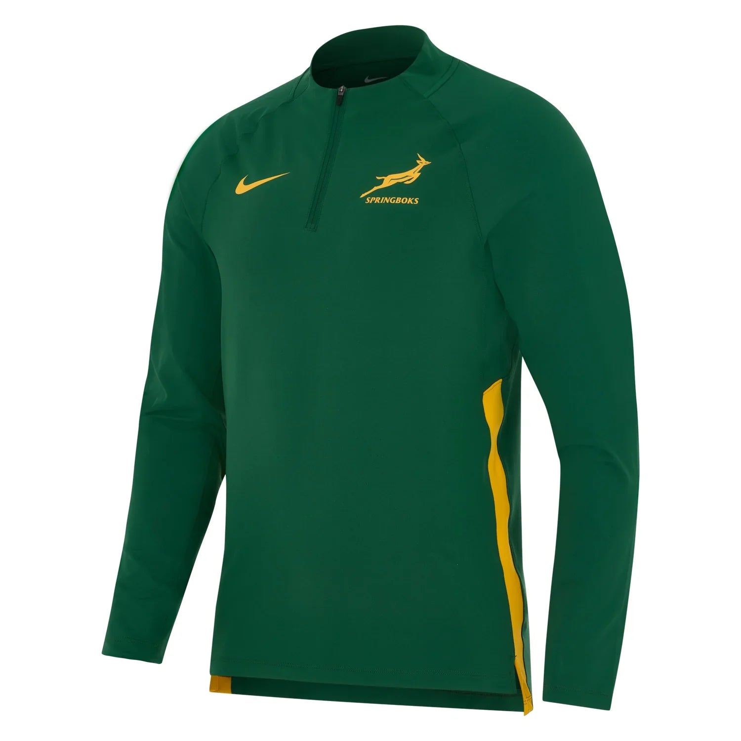Train like the champions with the official Nike South Africa Springboks 2025 Mens Training 1/4 Zip Top, featuring the iconic green colorway with distinctive gold side panels that mirror the team's legendary colors. This professional-grade training top combines Nike's advanced Dri-FIT technology with a practical quarter-zip design, while the authentic Springbok logo and Nike swoosh showcase your allegiance to South African rugby excellence. Engineered for both performance and comfort, this training top delivers superior moisture management and unrestricted movement, making it perfect for intense training sessions or casual wear while representing Springbok pride.