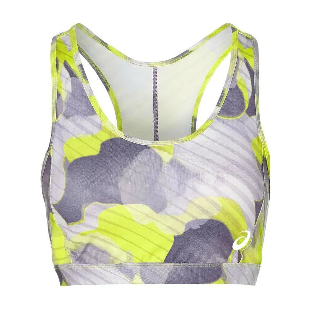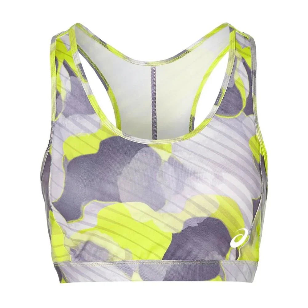 This graphic print sports bra for women is made from a quick-drying fabric that wicks moisture away from the skin for outstanding comfort. Its racerback shape reduces pressure on the shoulders, while the non-stretch fabric provides additional support. Self binding at the neck and a merrow stitch seam also reduce chafing.